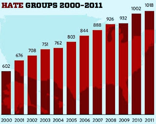 The Southern Poverty Law Center (SPLC) has just published its list of hate groups in the U.S. up through 2011: an increase in such groups of 61 percent in the last 11 years. The dramatic rise is due, the SPLC said, to the popularity of the Patriot Movement. It did not, however, imply that the increase was a result in America's decline in I.Q. (as I would have).